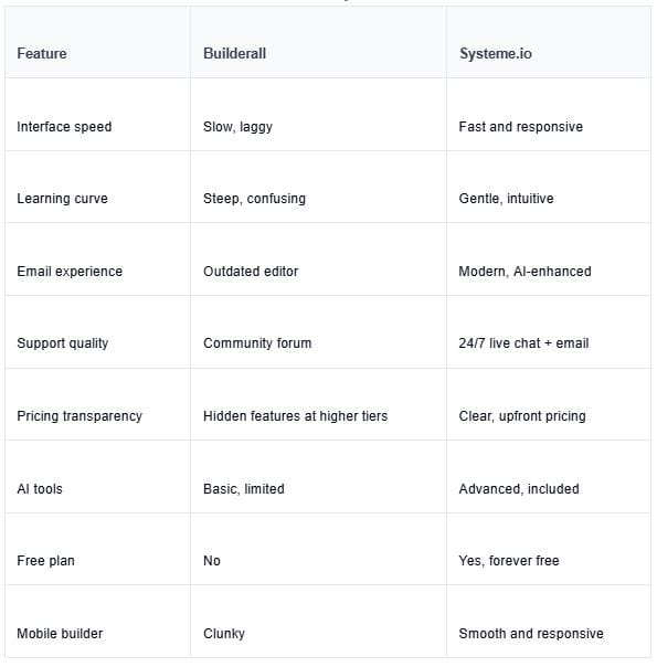 Builderall feels sluggish. Systeme.io, Podia, and MailerLite feel snappy. That might not sound important until you build 50 funnels and realize you're spending hours waiting for pages to load.