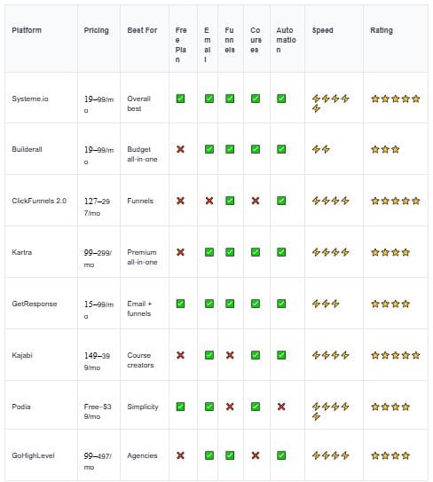 Systeme.io, Podia, GetResponse, and MailerLite all offer free plans. Builderall doesn't. That's a huge advantage for testing before paying.