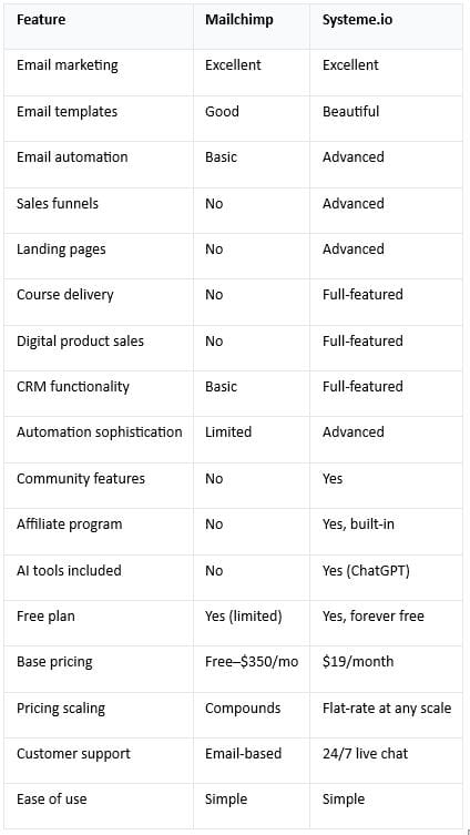 Mailchimp is email marketing. That's it. Everything else requires external tools. Systeme.io: True all-in-one. Email + funnels + courses + CRM + automation in one place.
