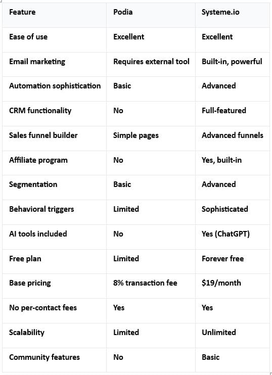 Systeme.io has all of these while remaining intuitive. Podia requires you to piece together other tools and limits your growth potential.