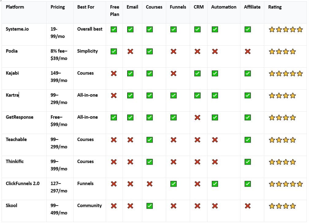 A: For scaling creators, yes. Systeme.io includes everything Podia lacks (email, automation, CRM, funnels, affiliate program) while remaining easy to use.