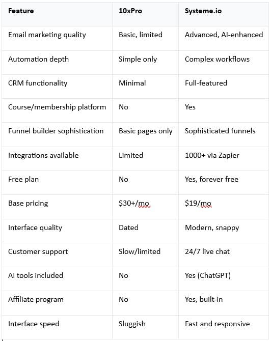 Translation: Systeme.io's Starter plan ($19/month) costs less than 10xPro's entry tier but includes email marketing, automation, CRM, courses, and funnels that 10xPro doesn't offer.